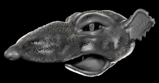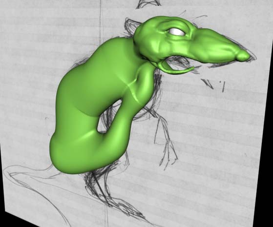 My favourite way of building a creature is the most natural way. So I decided to use ClayStudioPro that provides a method similar to traditional techniques. I started with a sketch drawing mapped onto planes as construction helps placed at the center of the 3D working space. |
